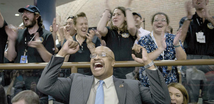 ELATED: NASA and project staff react with joy as telemetry is received from the New Horizons probe at the Johns Hopkins University Applied Physics Laboratory in Laurel, Maryland Tuesday. AFP