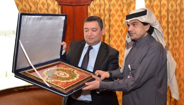 Hikmatullozoda presents a souvenir to al-Shaibei following his meeting with the QIIB chief executive yesterday.