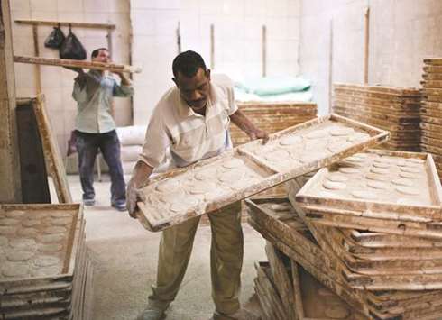 Workers arrange trays of dough for baking bread in a bakery in Cairo. Egypt’s Public Prosecution Office is looking into the case after the quarantine office stopped a 63,000-metric-tonne Romanian wheat cargo shipment at the port of Safaga for containing poppy seeds, the Agriculture Ministry said.