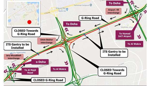 The Public Works Authority (Ashghal) has announced a temporary closure on G-Ring Road for those heading to Hamad Airport between Umm Besher IC and Al Matar 49 Interchange from 9pm Friday until 4am Saturday and from Saturday night to Sunday.
