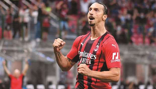 AC Milan’s Zlatan Ibrahimovic celebrates his goal during the Serie A match against Lazio at San Siro in Milan, Italy, yesterday. (Reuters)